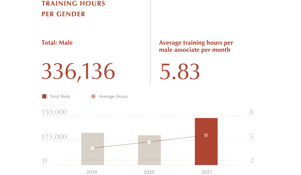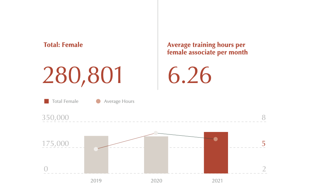 - In terms of training hours, female associates averaged 6.3 hours per month, while male associates averaged 5.8 hours, with both surpassing our target of 5 hours per month per associate.