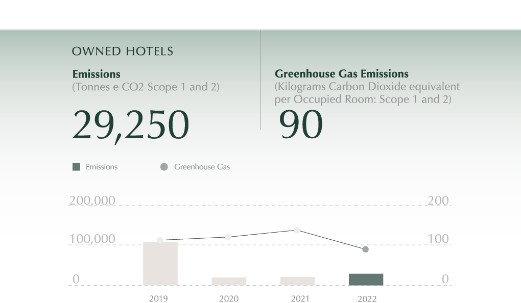 At this time, this Report does not cover indirect emissions (Scope 3) from operations not owned by the company in the value chain upstream (travel, employee commuting waste, purchased goods and services and their transportation, guest travel and capital goods) and downstream (franchises, leased assets). However, we are measuring baseline Scope 3 emissions in 2023, in anticipation of expanding future reporting.