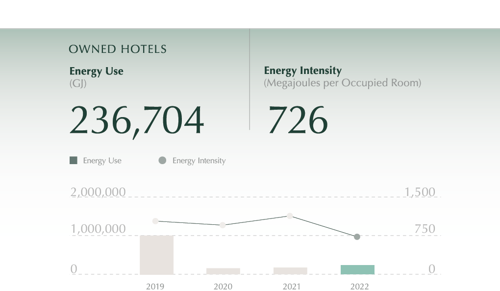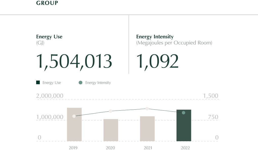 • Compared to our baseline of 2019, total energy use and corresponding Scope 1 and 2 greenhouse gas emissions (GHG) in 2022 were lower by 6%, despite the number of properties increasing from 47 to 63. This was due to improved efficiency and some temporary closures.