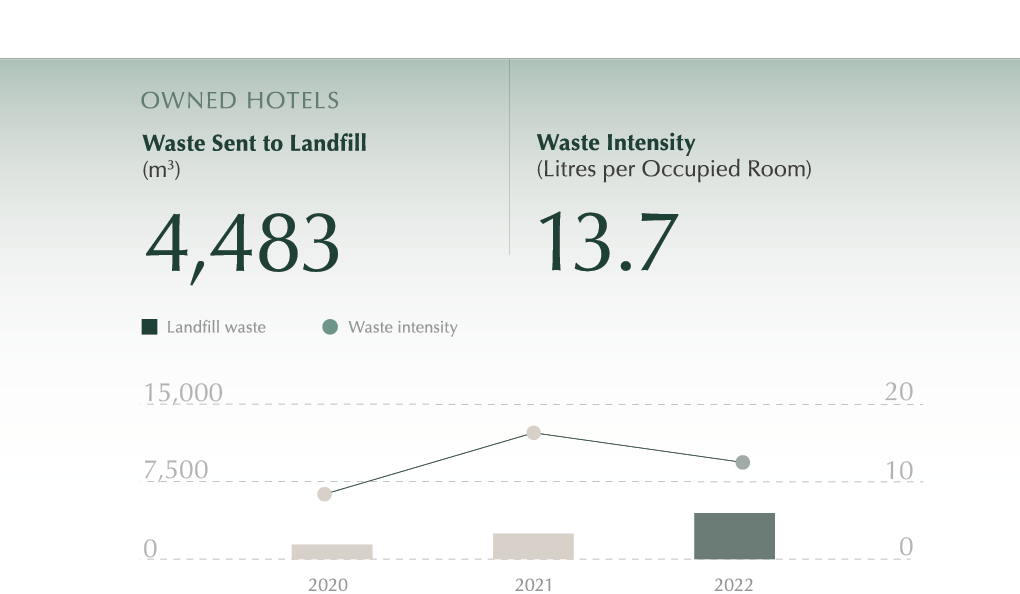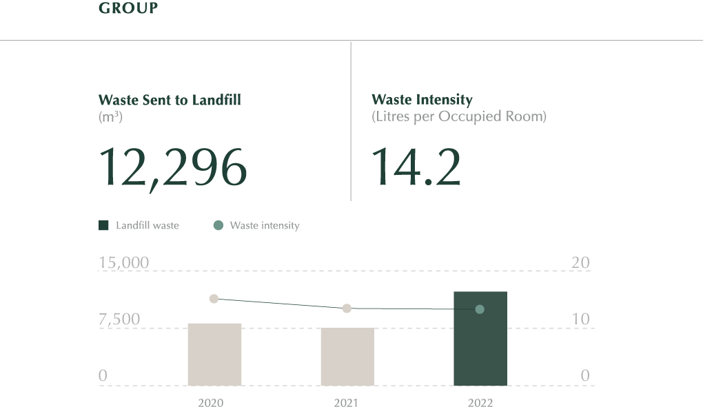 We define waste as solid and liquid waste excluding water and emissions. We report total waste as the sum of all Group-owned and managed hotels. We also present data from hotels and resorts per occupied room (POR) so that they are comparable even when occupancy varies. Waste data were unverifiable or incomplete for Angsana Corfu, Cassia Phuket and Angsana Teluk Bahang were not included.