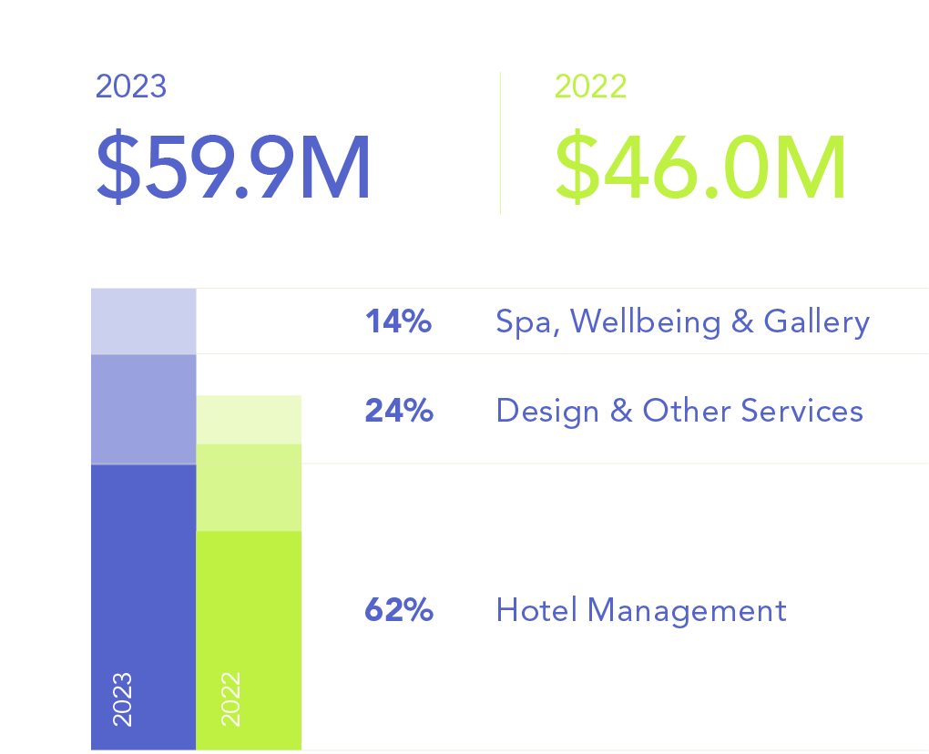 The Group’s iconic Spa, Wellbeing and Gallery operations registered total revenue of $8.6 million in 2023. Operating Profit increased by S$2.4 million, turning from a loss of S$0.3 million to a profit of S$2.1 million. Contributing to this were improving market conditions and successful Group-level promotions. With the Group’s hotels anticipating increasing occupancies and a higher capture rate, we expect continued revenue growth in 2024.