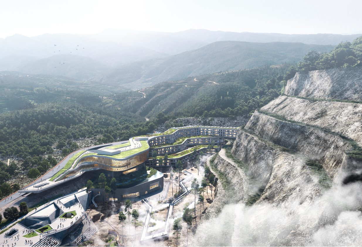 A blend of functional design and ecological restoration has transformed a former limestone quarry into a paradise. With lush gardens and hot spring pools, it merges seamlessly with nature. Natural materials like Tangshan Mountain rocks and interior spring baths blur the line between architecture and the natural world.
