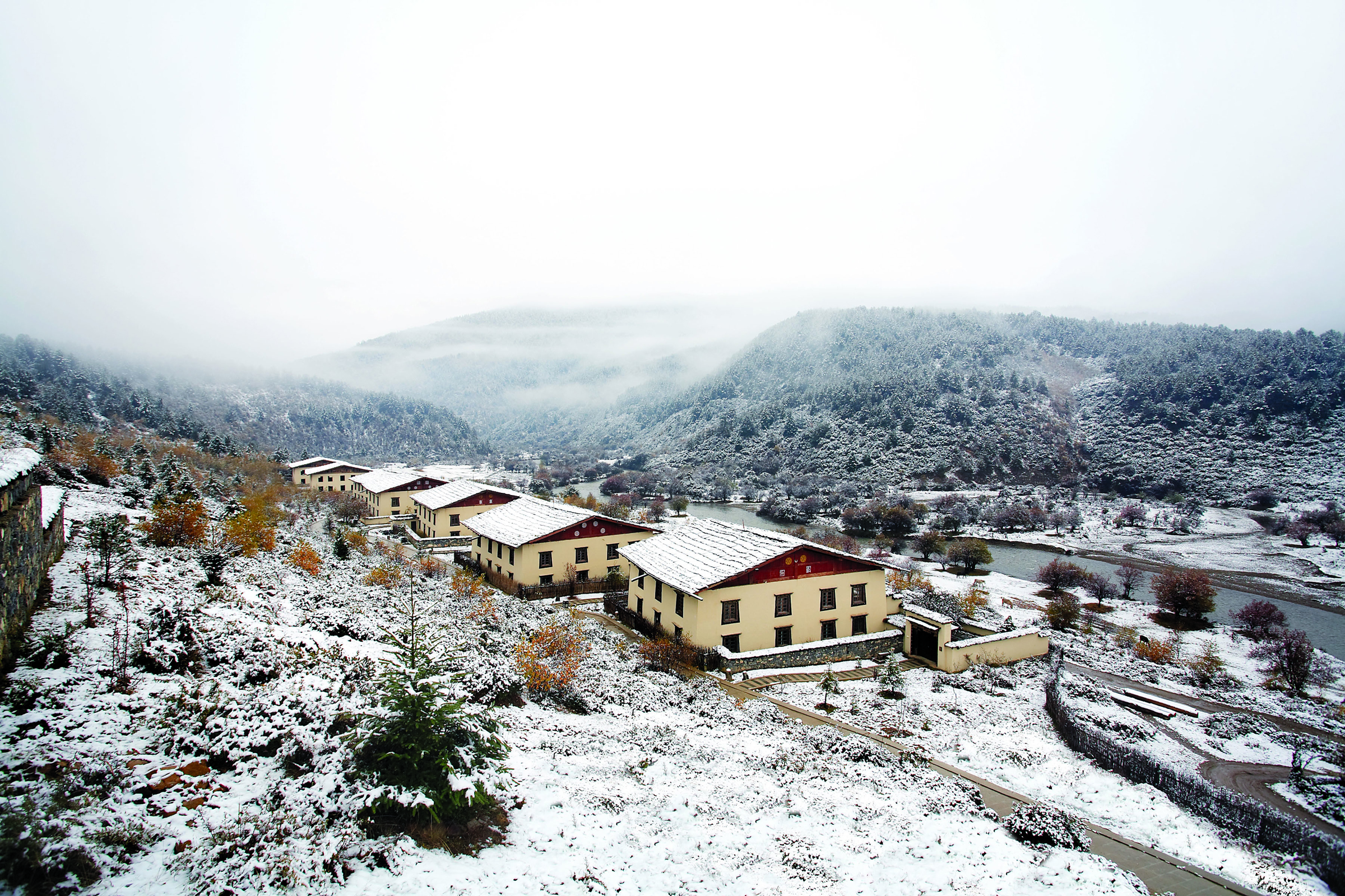 To preserve the culture, heritage, and ecological integrity of Shangri-La County in China, 18 Tibetan farmhouses underwent a careful process of disassembly and relocation. These spacious dwellings housed generations of Tibetans, their livestock, and harvests. Today, they are adorned with dark timbers and vibrant red furnishings, which captures the essence of Tibetan tradition and harmonises beautifully with the natural surroundings.